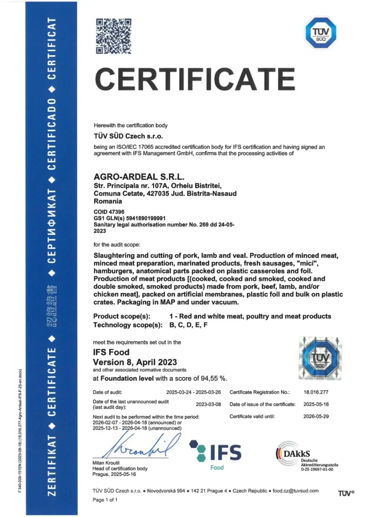 Agro Ardeal este certificată IFS, FSSC și BSCI – standarde internaționale ce garantează calitate, siguranță alimentară și transparență.